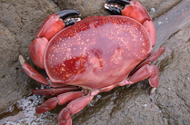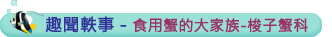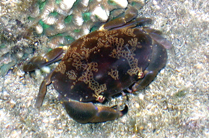 生態描述:俗稱「大狗仔」,喜棲息於珊瑚淺坪、岩礁的石縫處,白天多躲棲岩礁縫隙中,夜晚則活躍於岩礁間。常被漁民捕捉作為用延繩釣釣獲邵氏寒鯛之餌料用,也是每年2~4月返回潮間帶產卵的澎湖章魚重要的食物來源,有民眾專捕母蟹後以蒸或醃製的方式食用。但近年棲地因受人為(踐踏珊瑚淺坪及大量採捕)或自然因素(劇烈天候所造成的惡劣海象將珊瑚礁破壞),族群數量較往昔相比已減少很多了,在澎湖各潮間帶海域經常可見其蟹蹤且族群數量龐大。 |