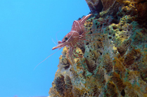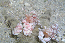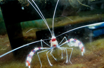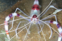 生態習性:是典型的清潔蝦,通常以魚體體表的寄生蟲為食。其體色十分艷麗美觀,動作輕盈優雅,為海洋中的美麗天使。最大體長可達6cm。櫻花蝦常成對棲息岩礁或珊瑚礁下的縫隙,因美麗的外表及與其他生物如魚類具共生的特殊生態行為,是水族業者青睞的種類之ㄧ。但由於排他性很強,在同一水箱蓄養觀賞時,應以1對為限。在澎湖各海域均有分佈,以潮下帶具岩礁或珊瑚礁海域或石滬的滬房裡都很容易發現其蹤跡。 |