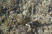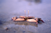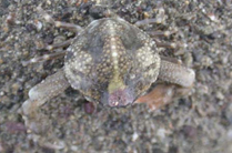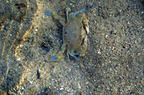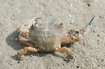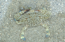 俗稱鑽沙蟹、沙隨或金錢蟹,棲息在7m以淺水的沙岸潮間帶至水深10~15m的海底上,善於游泳也能潛伏沙中。在澎湖主要的分布地點為,歧頭灣、觀音亭、蒔裡等地。 |