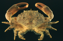 型態描述: 眼窩小,前側緣具齒狀且具毛,螯足壯大不對稱,步足短小,1~4對步足依次漸短。