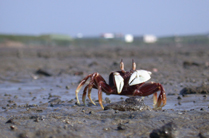 生態描述:成群穴居於潮間帶泥灘,退潮後拖泥帶水活躍於仍有積水的泥灘地。剛從洞口移出的個體會隱藏在渾濁的水中,僅露出細長雙眼觀察洞外之動靜,再緩慢移除洞外。雄蟹在揮舞鰲足時會挺立身體,高舉雙螯後再迅速放下,一直重複進行,如同日本人高舉雙手口呼萬歲般,因而以「萬歲」稱之。澎湖主要的分布地點為池西、大果葉、岐頭、青灣等地。 |