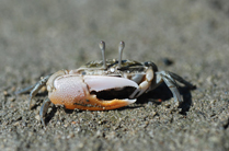 生態描述:又稱北方呼喚招潮、北方凹指招潮、呼喚招潮、黃敖招潮等。本種穴居於潮間帶下半部的泥灘地,在澎湖為常見種,會成群集結緊鄰水邊覓食。雄性揮舞大螯為垂直式,抱卵生殖其為每年的1~9月。在澎湖主要的分布地點包括重光、西衛、東衛、城前、瓦硐、通樑、岐頭、鎮海、講美、大果葉、池西、小門、青螺、紅羅等地。