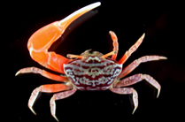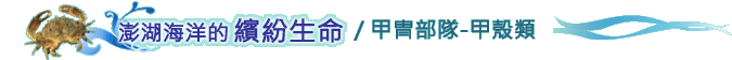 海裡的螃蟹及蝦子在分類上均屬於節肢動物門的十足目,牠們在海洋裡不僅擁有龐大的族群數量,在生態環境與社會經濟也扮演相當重要的角色。如沙蟹科的招潮蟹屬對環境的敏感度高,因此常被當作為環境指標性生物;真蝦類的德班氏活額蝦、櫻花蝦及油彩蠟膜蝦具有美麗的色彩及行為,而成為水族界的新寵;梭子蟹科的遠海梭子蟹、紅星梭子蟹及漢氏梭子蟹;對蝦類的鬚赤對蝦及日本對蝦等經濟性種類不僅滋味鮮,同時營養價值高,是目前支撐澎湖漁業重要的海洋生物物種之一。 |
